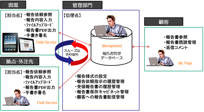 報告書の作成依頼機能では、現場・拠点ユーザーは依頼された報告書フォームですぐに報告を行うことができます。また、お客様は送付された報告書をすぐにマイページから受け取ることができます。